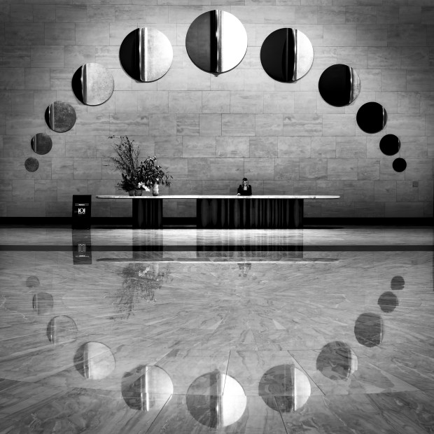 My compliments to the architect who designed this amazing foyer. My challenge was to capture the perfect symmetry it offered. My first few images were spent making minor adjustments in position and yet there was something just off about it. Then the receptionist walked in and seated herself and suddenly, it was perfect!