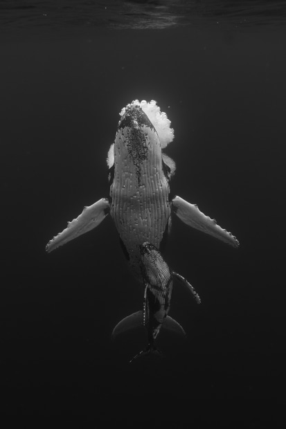 A humpback mother exhales just before she reaches the surface with her pectoral fins outstretched, completely relaxed, and her little one is almost mimicking her.
