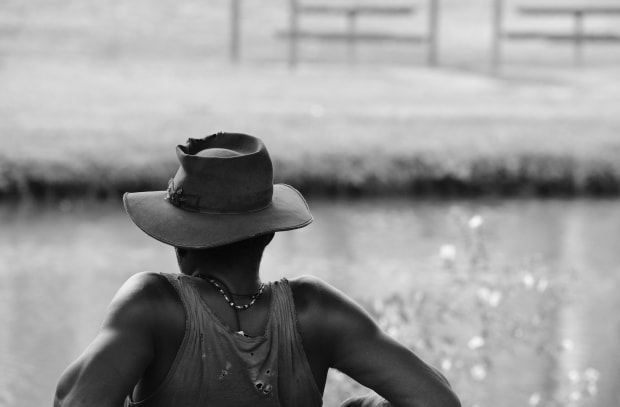 This gentleman was just chillin' out at the local park watching the ducks in the water.