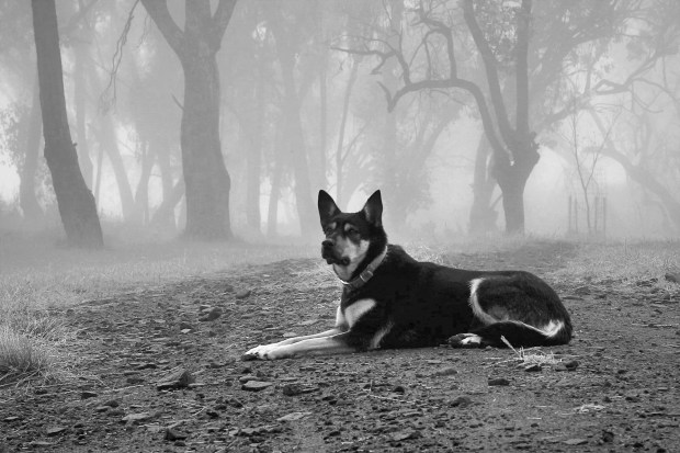 Our kelpie Sue sitting in the driveway of our property on a cold foggy morning