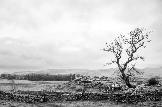 A lone tree surrounded by stone walls that run for miles and miles in the Yorkshire Dales.