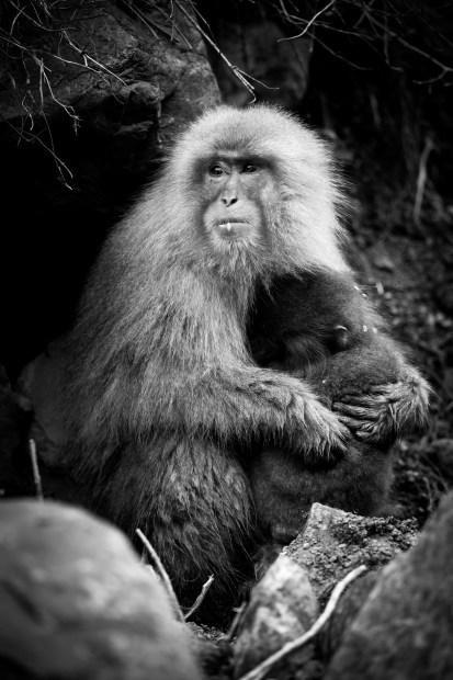 A mother tenderly cradles her child in the Valley of the Yokoyu River, Japan.