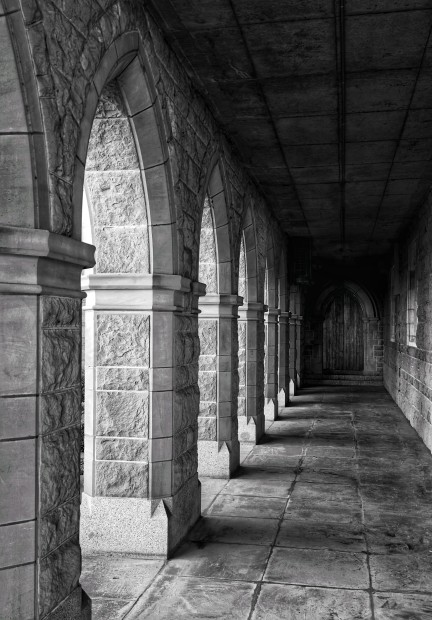 This monochrome picture captures the Gothic-inspired architecture of the outer arches of Bendigo Sacred Heart Cathedral. The play of light adds depth to the image where, amidst the shadows, a mystery door beckons, its presence hints at secrets concealed, inviting the viewer to ponder the mysteries that lie beyond its threshold.