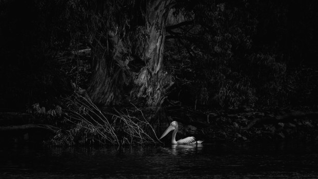 An Australian pelican (Pelecanus conspicillatus) scanning the river for fish at Dusk