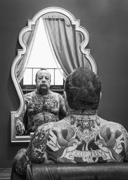 Reflective Photograph of Mez, owner of True Love Tatoos.
