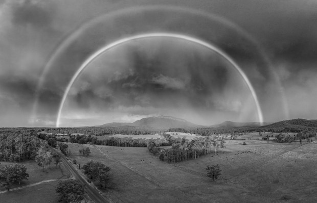 A perfectly timed photograph of a rainbow over Bago Bluff, with this shot taken moments after arriving on site after a 40 minute chance drive on projected weather conditions for hope of a rainbow, Byabarra, NSW