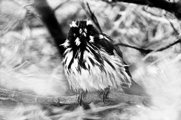 New Holland Honeyeaters are lively and nimble birds, often seen flitting from one flower to another in pursuit of nectar. Additionally, they are recognized for their "corroboree" or group displays, especially during the breeding season. After a swim in the pond, this New Holland Honeyeater perched on a branch to dry off before rejoining the group.