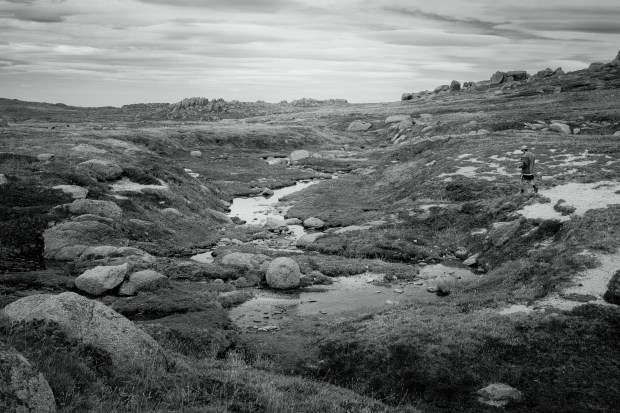 A lone hiker walks amongst brushes and rocks of the Snowy Mountains.