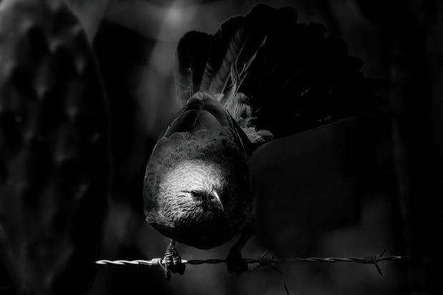 This Apostlebird watched my every move following me as I wandered across a bush paddock. Emerging from dark shadows gave definition to its plumage and the light also highlighted on one side of its face , claws and the barbed wire . Taken with 500mm fulled extended lens keeping a respectful distance in its environment.