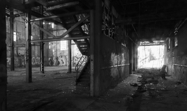 Old paper mill in decline. Inhabited by pigeons, smell of dust and scrap metal. Sees signs of occasional humans, graffiti artists and addicts.