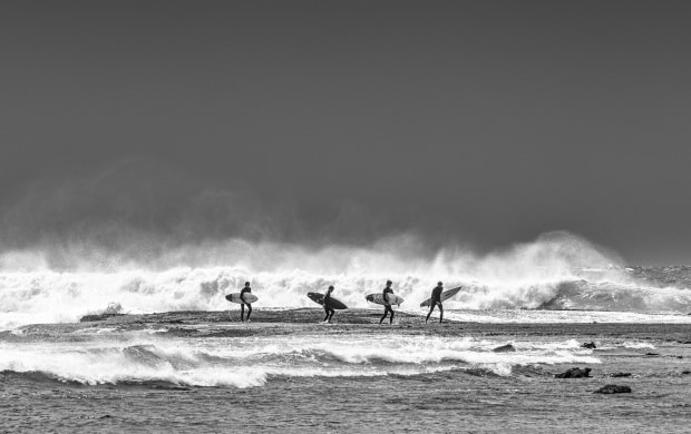 Further proof that I should keep on looking back at a scene even though I think I have captured everything. There’s ALWAYS something to see in the rear view… A wander around Long Reef Headland, Sydney blew away the cobwebs thanks to some incoming gnarly weather, and I snapped away at the clouds and big waves. I was heading back to the car park when I turned for one last look across the reef and saw John, Paul, George and Ringo heading home too, before the impending darkness behind them hit.