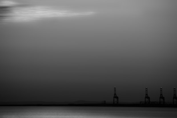 The view across Moreton Bay from Shorncliffe early evening, showing the oil refinery lights.