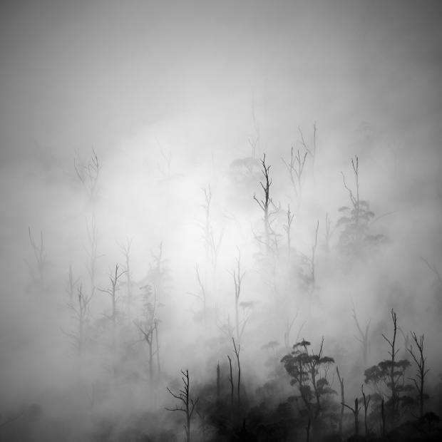 This image was taken kunanyi/Mount Wellington and shows a fire-ravaged forest gully comprising large Eucalypt sentinels towering over regrowth. Taken with Fujifilm GFX100 and a 350mm lens. f/11 at 1/8 second