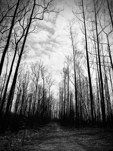 Our walks in the bush were decimated by the raging fires in Australia last summer. What looks like a wintry landscape is actually the burned out and broken stumps of the remaining trees.