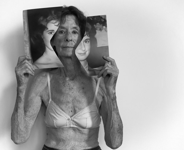 My 84 year old mother holding a photo of herself at 19. At 20, she became a mother, endured domestic violence and mental illness. Now she is old, her decisions are her own and she has regained control. I am trying to illustrate that Age bursts through beauty and youth, and is the greater gift.