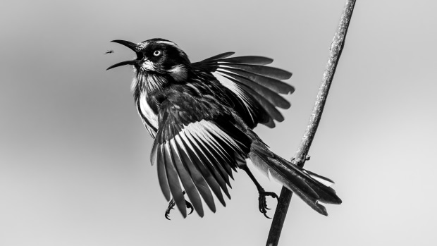 A New holland honeyeater reaches for an insect snack at the Australian national botanic gardens in Canberra.