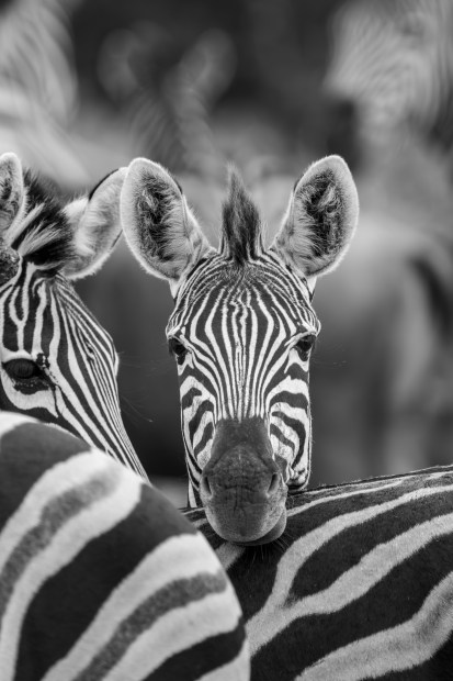 Amongst a herd of zebra, this particular one was enjoying the spotlight as it watched us while resting on the closest back it could find.