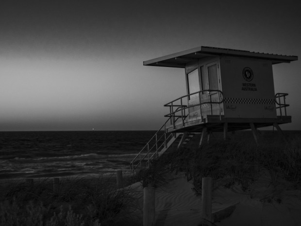 The desolated watch tower on Scarborough Beach looks lonely in the fading twilight.
