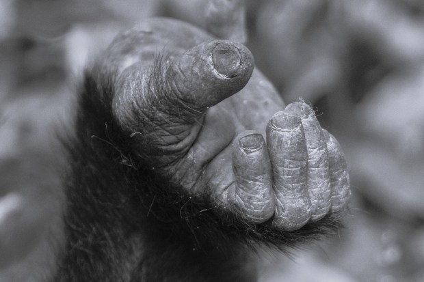 This intimate close-up captures the weathered texture of a chimpanzee's hand, its curled fingers suggesting both strength and sensitivity. A quiet, tactile presence inviting you to reflect on the subtle connection between human and animal. Image taken Kibale National Park, Uganda.