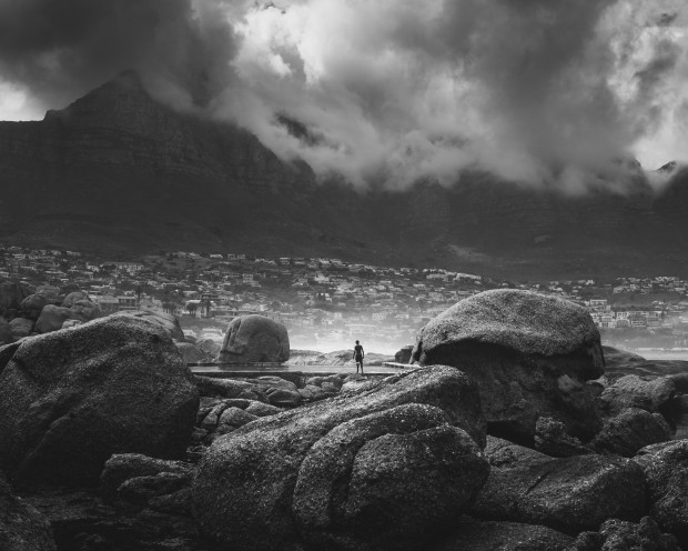 A lone boy standing among the boulders on Camps Bay, looking up to Table Mountain, Cape Town.