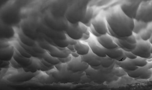 A lone bird silhouetted against dramatic storm clouds over Jamberoo, NSW.