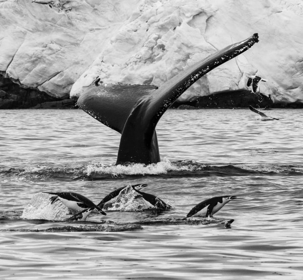 Antartica 2025 Taken from a boat with Whales and Chin Strap Penguins and the birds flying above.