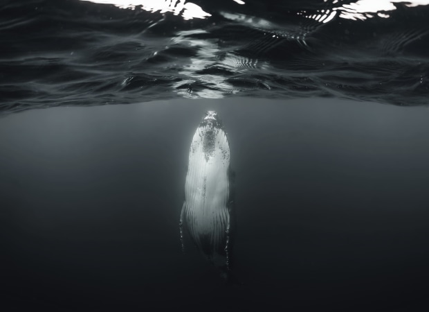 A humpback whale comes eye to eye with me, moments before breaking the surface tension