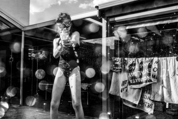 An armed little outlaw by the pool with a water-loaded gun is considered innocuous and adorable