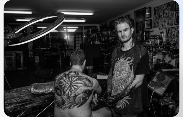 Brisbane tattoo artist Jacob Ditchmen and client Jack Maynard with a work inspired by a HP Lovecraft character. The artwork was completed across multiple sessions over three years. Nikon Z8