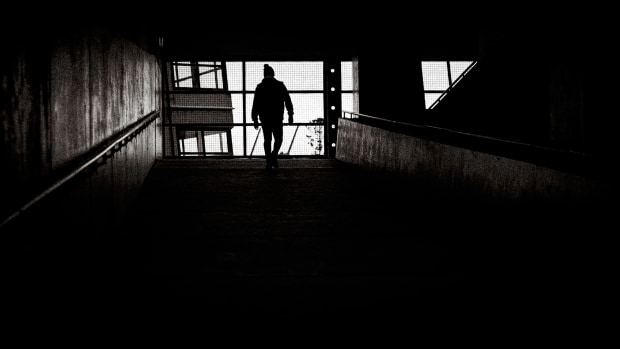 A lone supporter ascends the long ramp of a stand at the MCG, backlit by afternoon winter sun.