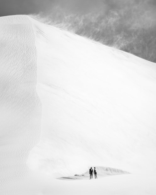 With the wind whipping the sand into the air at the top of this massive dune, a couple stand below contemplating the challenge of reaching the peak.