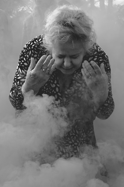 This photograph was taken on 22nd April, 2023 at the Horsham Botanical Gardens, Victoria on Wotjobaluk, Wergaia (Were-guy-ya), Jupagalk, Jaadwa and Jadawadjali people. The image was captured during a wedding ceremony. The guests incorporated a range of different cultures and nationalities and as part of the celebrations, the wedding was opened with a traditional indigenous smoking ceremony. The Aunty in this photograph is Aunty Jill, a relative of the groom.