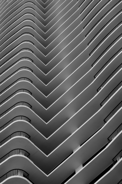 Balconies form a geometric pattern, with the corner projecting a strong vertical line.