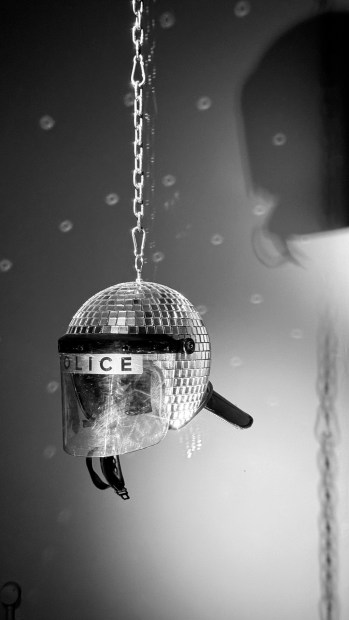 This home entertainment lighting system is made from an old Police riot helmet and approximately 650 little mirrors displayed at The Outsiders