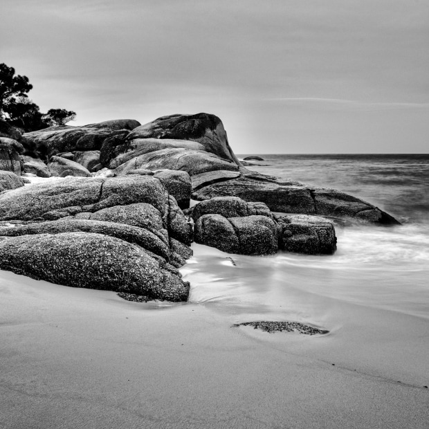 Long exposure of Bay of Fires granites late on a summer evening on a deserted beach