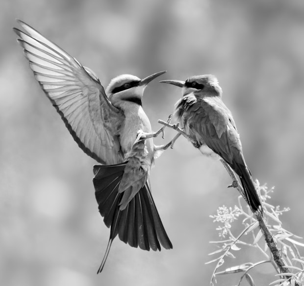 I go to Central and Northern part of Victoria each summer during rainbow bee-eater’s breeding season, in order to photograph those beautiful birds coming all the way from Queensland. It was my luck to have captured this image which reflected an impressive moment: the male rainbow bee eater swept toward the female with lively, deliberate energy, his wings spread wide just for her. His approach was confident yet gentle, a clear sign of his interest. The female remained poised on the branch, watching him, while his graceful flight and vibrant plumage express a quiet but unmistakable attraction.