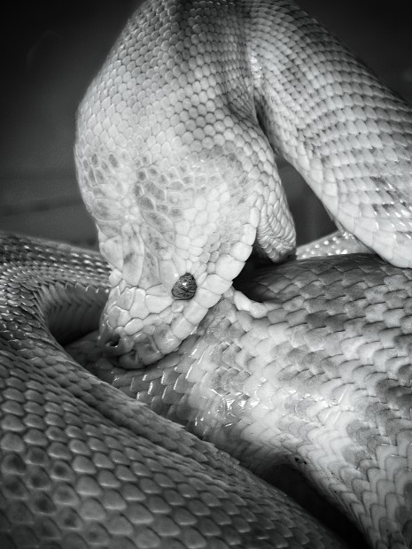 albino python missed the rat and latched onto himself so he couldn't escape... iPhone shot