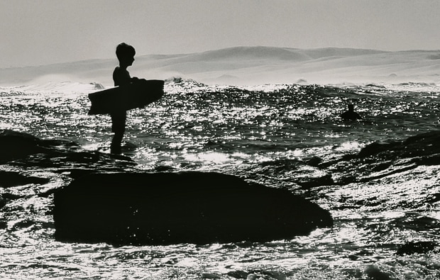 Birubi Beach st 6pm on a hot summers day. The boy is preparing to launch himself off the rock, as the tide is coming in