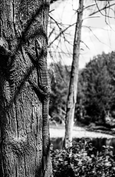 A goanna out in the bush, soaking in the sun on a tree and blending in with it's surroundings (Hill End, Bathurst, NSW)