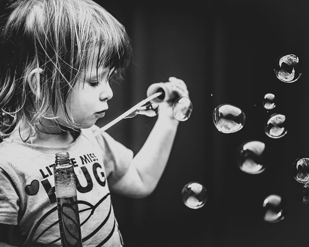 Whilst teaching my two year old how to blow bubbles using a bubble wand, I told her to "blow like the wind" in order to get them to fly.