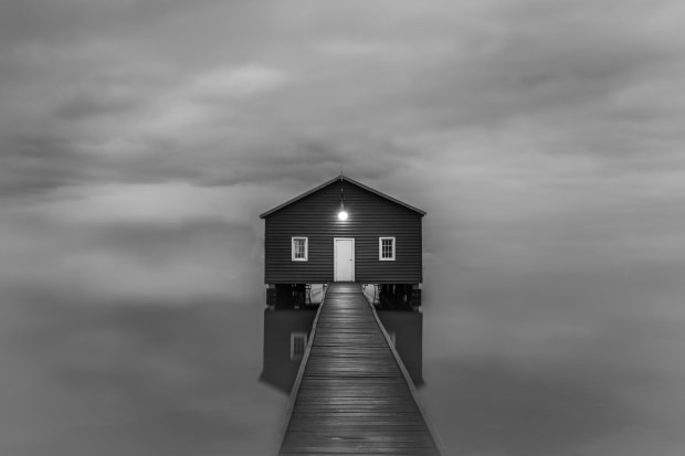 This old boat shed has become an iconic building in Perth. This particular was very cloudy which gave the shed a slightly otherworldly look with the cloud reflected in the still water.I tried to capture that sense of mystery by using mono colour