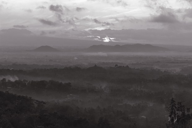 The spectacular sunrise over Borbodur; morning fog hangs low over the town with the famous temple centrally visible.