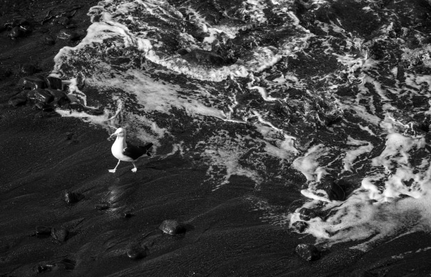 A gull emerges from the water and struts down the beach.
