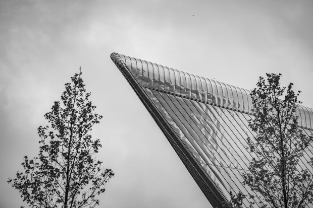 Man-made structure between two trees. This is Rotterdam Centraal Station, in the Netherlands.
