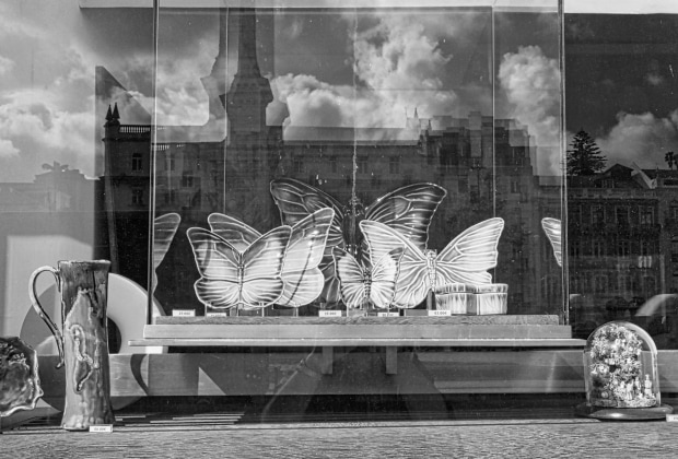 We were walking down a street in Lisbon,Portugal,and came upon a shopfront with these cloud reflections as well as the butterflies in the shop display.