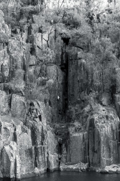 On a late summer afternoon when the Cataract Gorge in Launceston was already deep in shadow, a climber scales the towering dolerite cliffs, guided by his mate above.