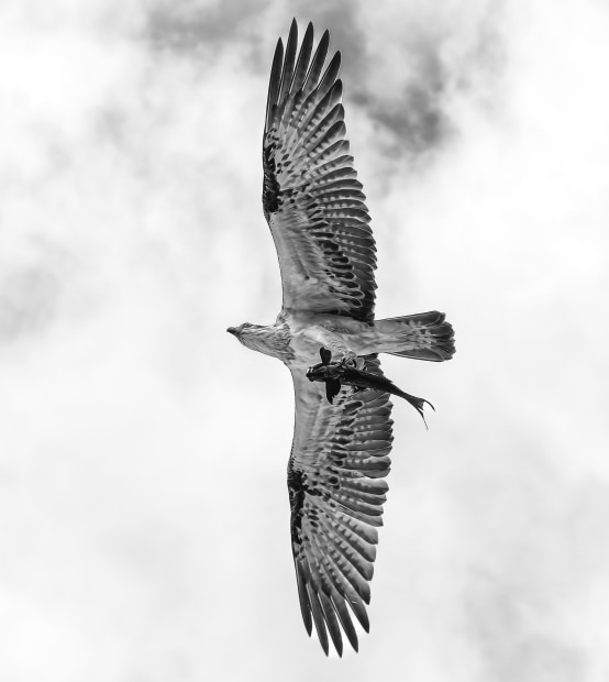 Shot this large Osprey at Meelup Beach , South West WA . It had been struggling to hold a large catfish it had caught . Finally, after a near grounding, it got control and flew directly over me . A well earned lunch.