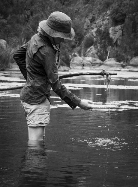 A hot summer day, after a long bushwalk into a gorge. My son, cooling off, playing with the reeds and algae, watching the patterns as he moves about the water.