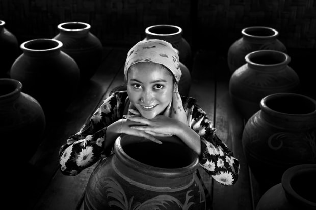 Studio portrait with hand-painted clay pots, Bogor, Indonesia.