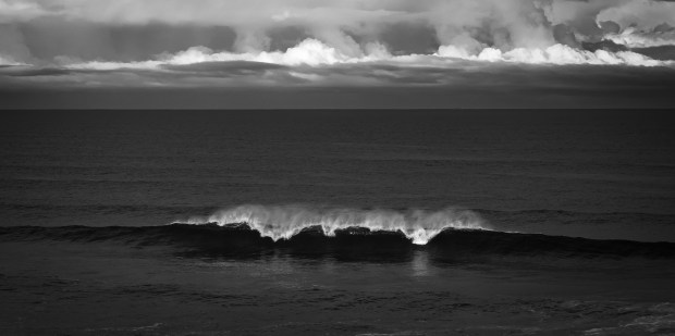 I noticed interesting clouds at Spray Point, a local beach, above a flat sea; suddenly a wave broke, and it struck me the clouds and wave mirrored one another
